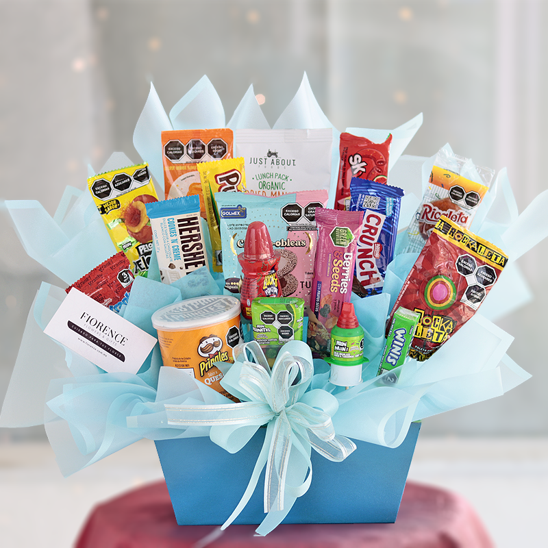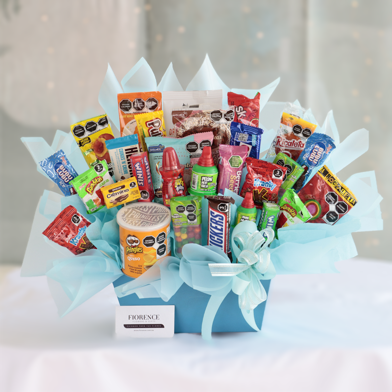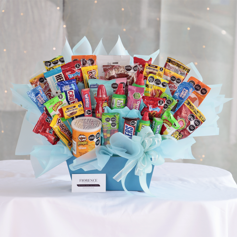 This fantastic Candy Bouquet is full of tasty snacks, sweets and chocolates. It will be a great surprise to celebrate someones Birthday or an excellent centerpiece for a Birthday Party.