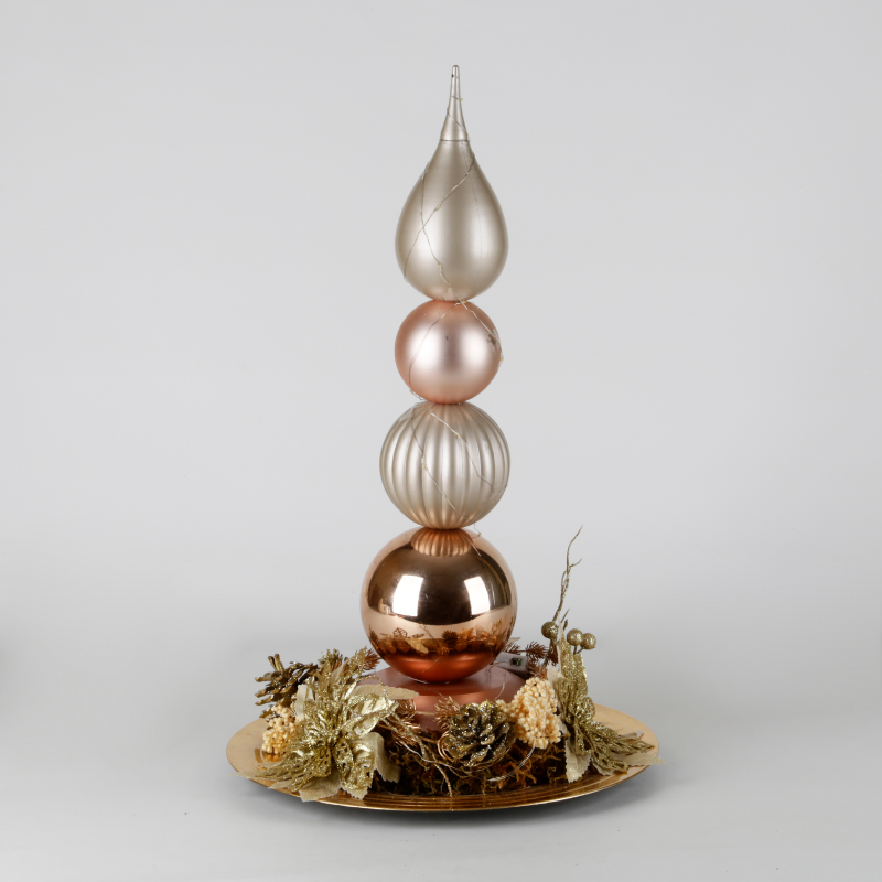 Beautiful minimalistic tree with Christmas ornaments, pinecones, poinsettia flowers and fine foliage placed in a a circular vase 30cm in diameter. Led lights included.