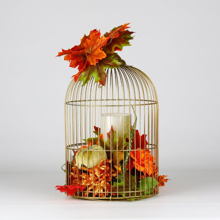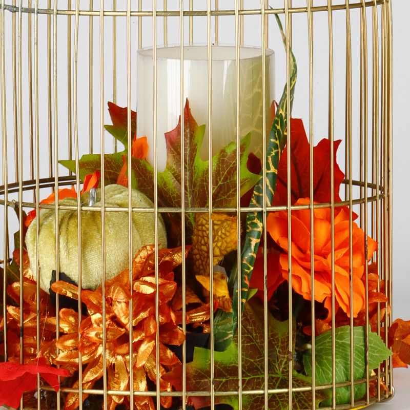 Adorno Otoñal con Vela LED en Jaula Dorada