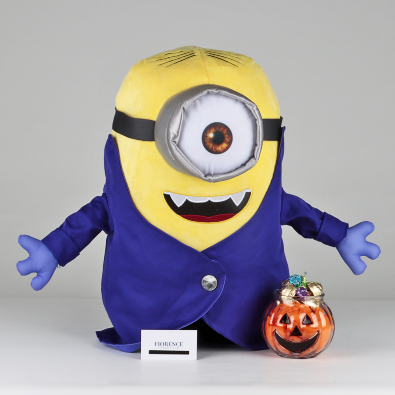 Sorprende a esa persona especial con este tierno regalo. Peluche Minion con disfraz de Drácula de 47 cm de alto acompañado de una calabacita de cristal con 150 gr de chocolates surtidos.