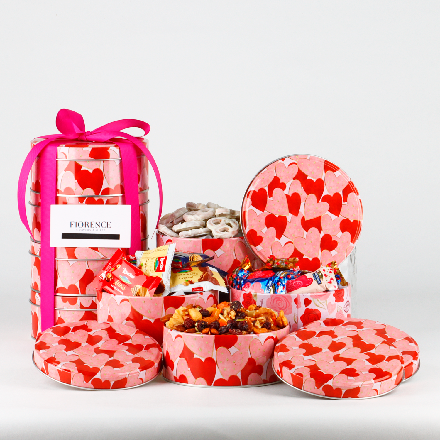 Expresa tu amor con nuestra Torre de Regalo “Cuatro razones para amarte" que incluye cuatro cajas metálicas festivas, cada una llena de una selección de dulces y deliciosas golosinas gourmet.