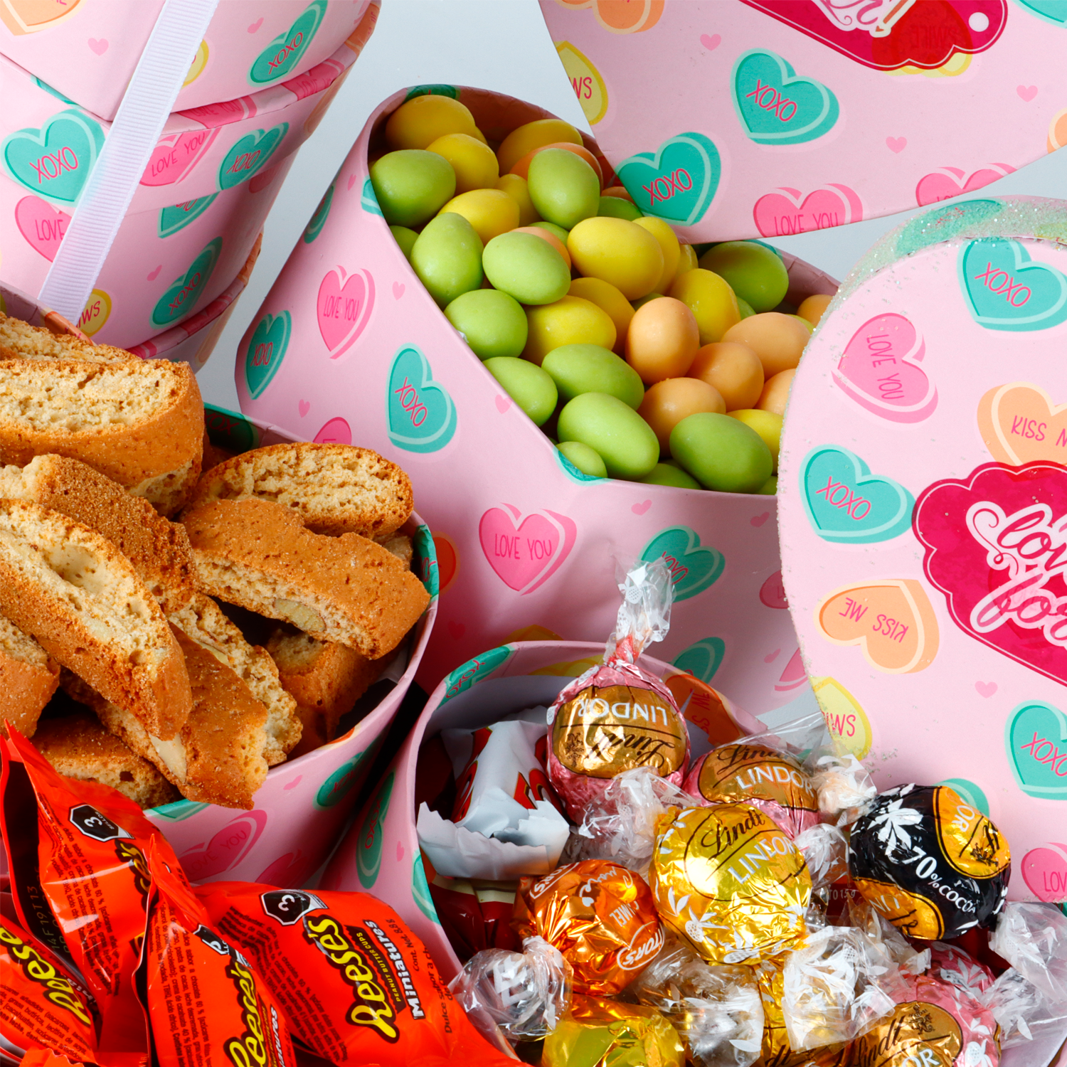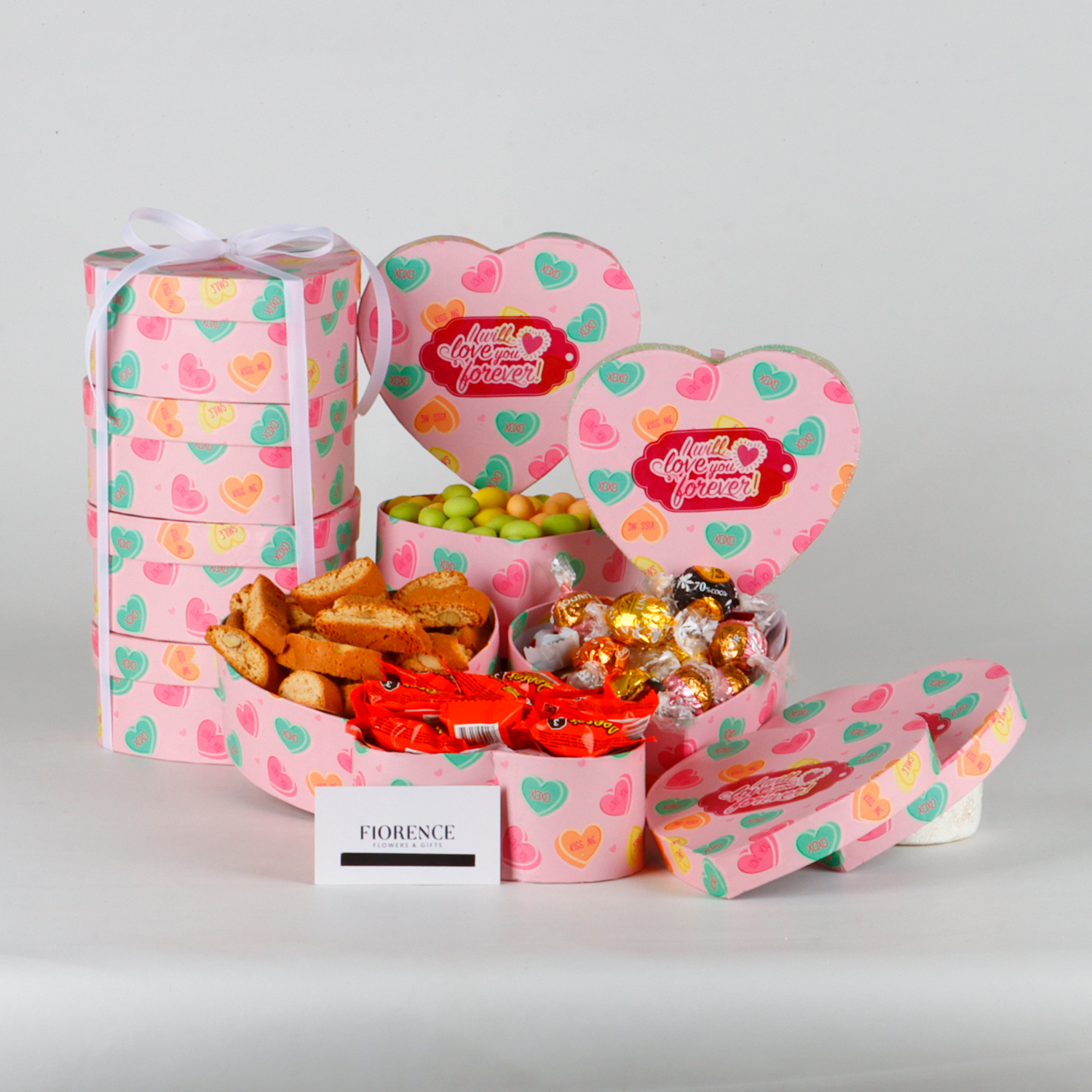 Endulza cualquier ocasión con esta torre de regalo que incluye cuatro cajas en forma de corazón llenas de una deliciosa selección de dulces, perfectos para compartir y disfrutar.